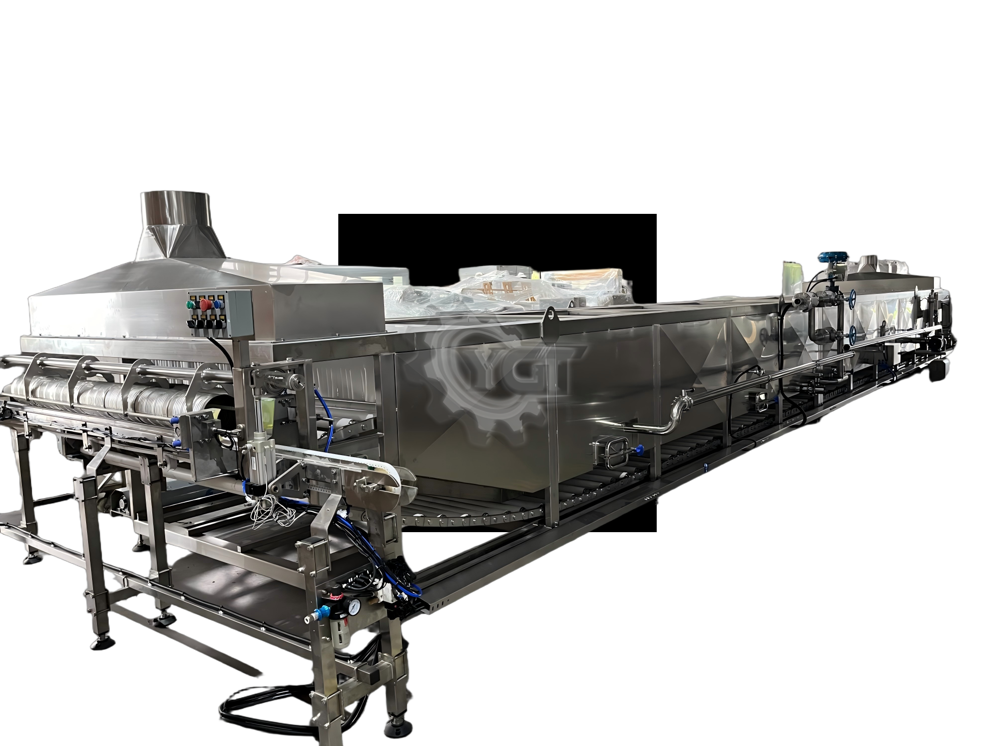 El esterilizador por baño de agua es una máquina de pasteurización y esterilización continua diseñada para productos alimenticios líquidos o semilíquidos envasados. Al sumergir los productos en agua circulante calentada, se garantiza un tratamiento térmico uniforme, se preserva la textura y la nutrición del producto y se garantiza la seguridad alimentaria. Ideal para envases flexibles como bolsas, botellas y bandejas.